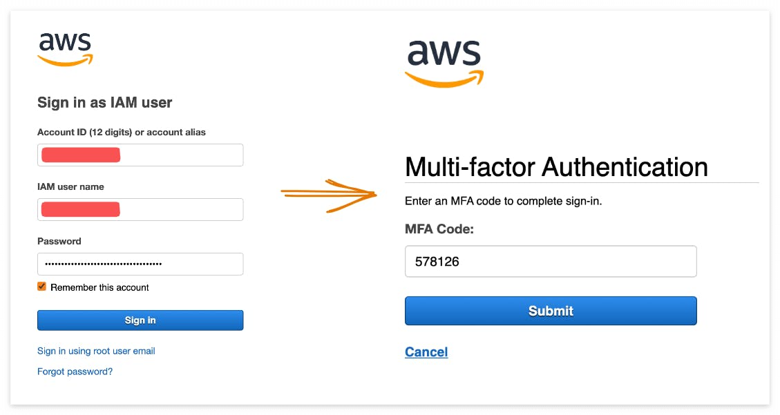 사용자가 시스템에 액세스하기 전에 두 가지 이상의 인증 형식을 제공해야 하는 보안 메커니즘. AWS에서 MFA는 AWS 계정과 리소스 보안을 위해 사용 됨.
