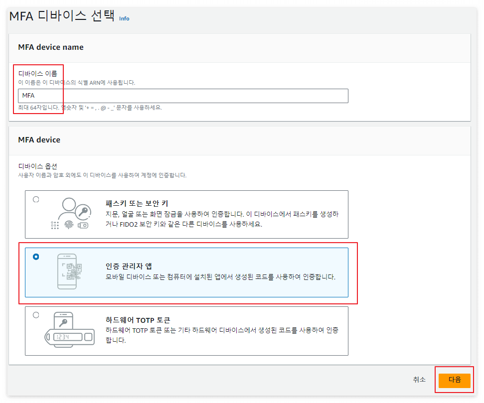 4. 디바이스 이름, 인증 관리자 앱을 선택하고 다음