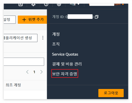 2. 우측 상단 계정 부분을 확장해 보안 자격 증명 클릭